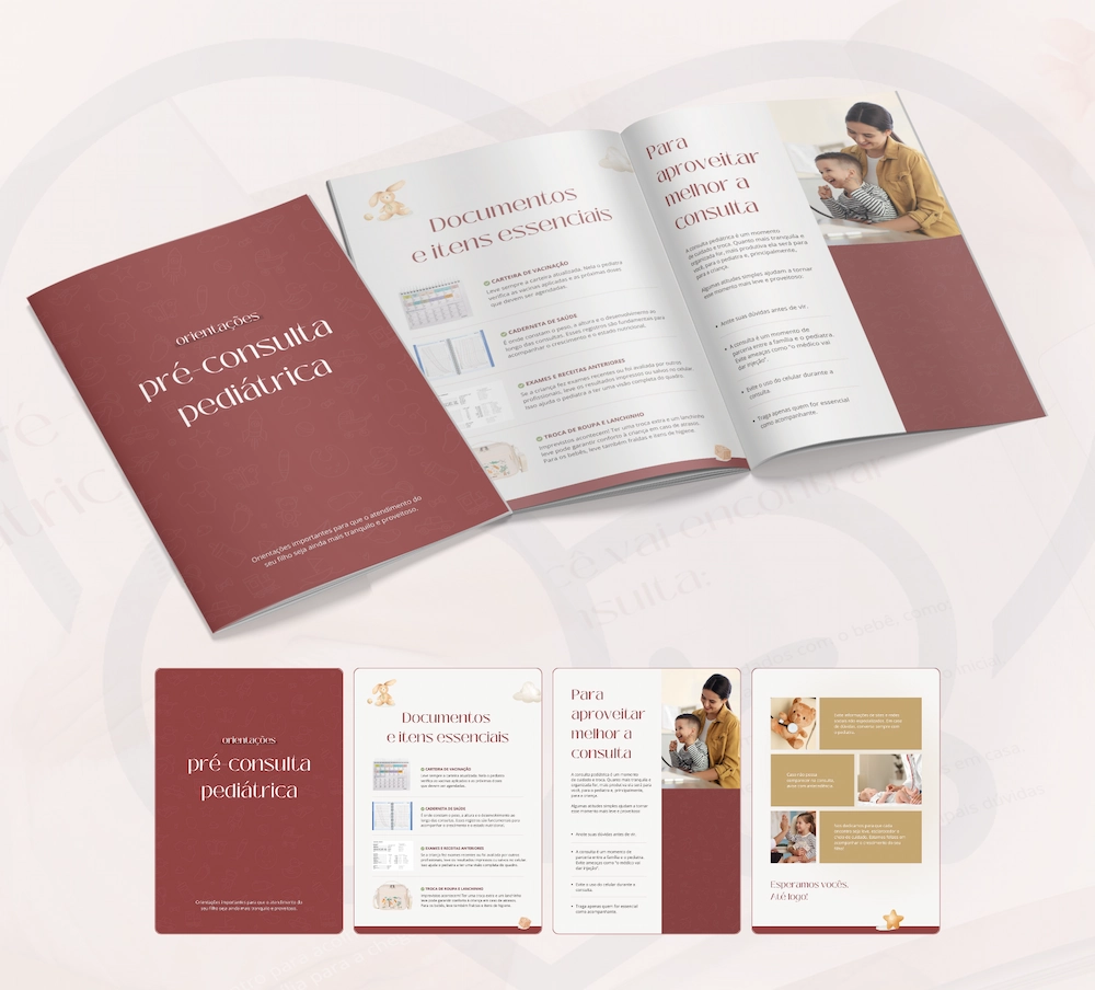 Exemplos: Orientações Pré-consulta Pediátrica, Consulta Pré-natal Pediátrica, Frequência de Consultas, Workshop de Introdução Alimentar. Tudo 100% editável.